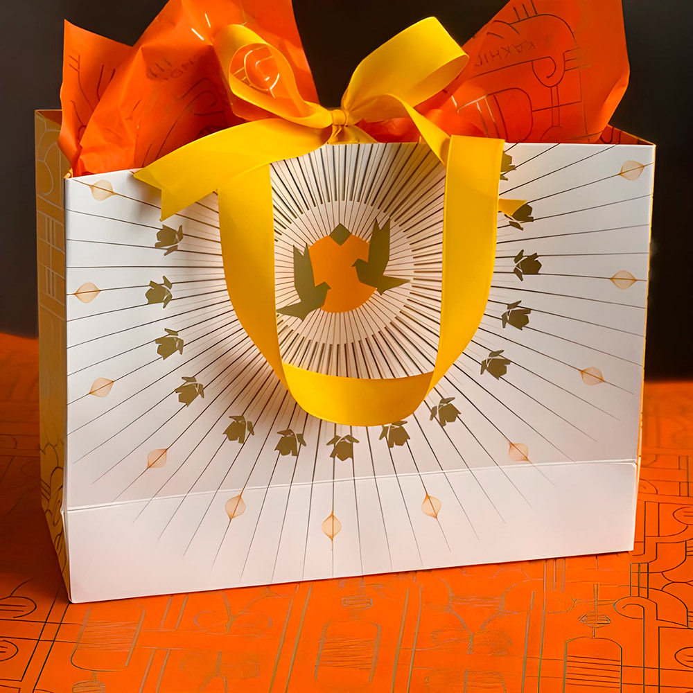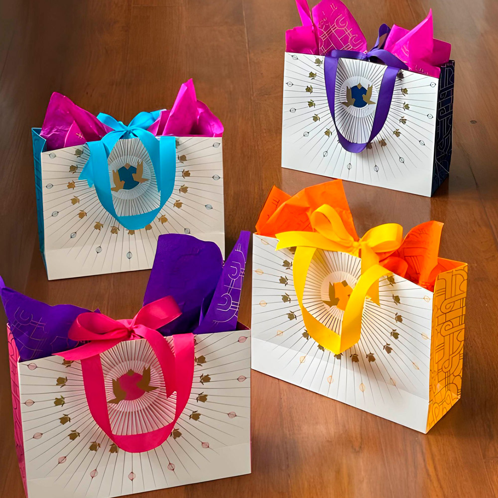 Comes with a ribbon handle, ribbon loop for that perfectly placed bow, and gift tag strung in. To finish it all, it comes with a bright contrasting tissue paper. All you need is the gift!