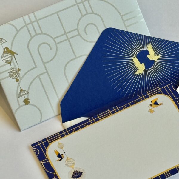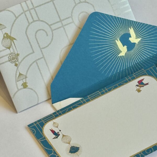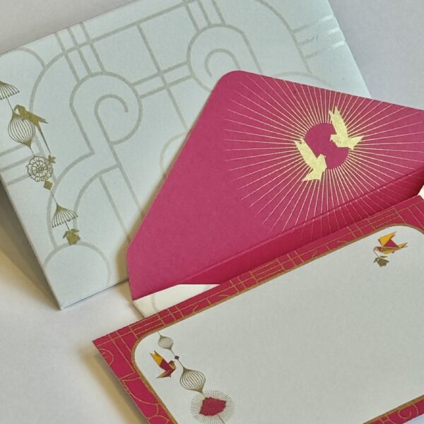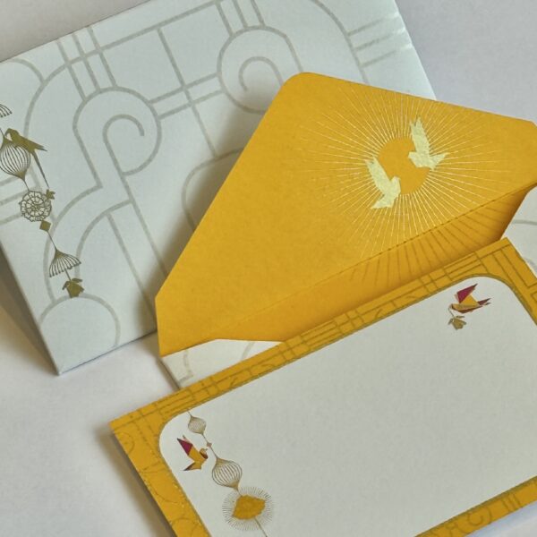 Accents of metallic gold print shimmer across the collection, echoing the glint of diyas and fireworks, while delicate birds in flight bring a sense of movement and freedom to the scene. With vibrant, pure colors and luminous details, Indie Glow captures both timeless tradition and modern design—crafted for those who cherish beauty in the details and wish to bring a touch of festive radiance into every note, gift, or celebration.