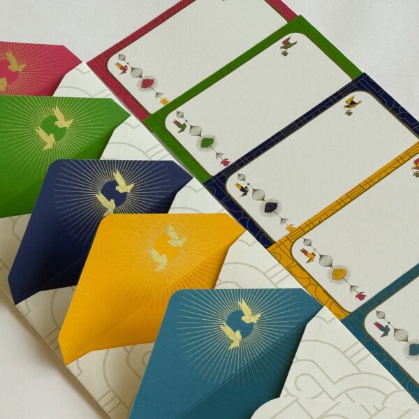 Each box contains a set of 10 flat notecards, 10 envelopes, and 10 stickers.